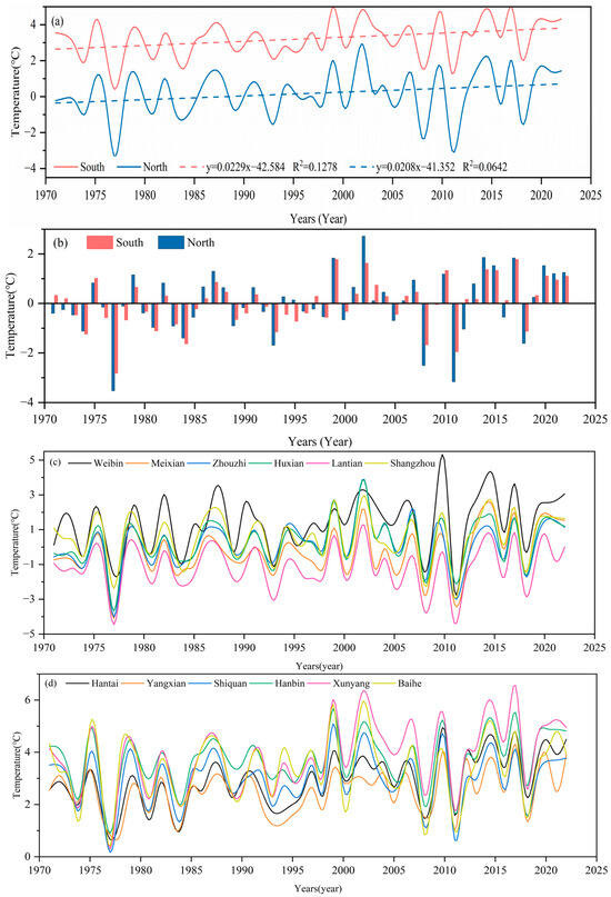 The comparative analysis of the daily mean annual temperatures between the North and the South (Figure 2a) reveals distinct regional trends. The mean annual temperature in the South was recorded at 15.32 °C, with a warming trend of 0.266 °C/10a. The highest and lowest annual temperatures in the South were observed in 2016 and 1989, registering 16.57 °C and 14.32 °C, respectively, indicating a variability of 2.25 °C. In contrast, the northern region exhibited a mean annual temperature of 13.56 °C, with a slightly higher warming rate of 0.300 °C/10a. The highest and lowest temperatures in the North occurred in 2013 and 1984, at 15.04 °C and 12.29 °C, respectively, showing a greater range of 2.74 °C. Interestingly, both regions recorded their highest and lowest mean annual temperatures in the 2010s and 1980s, respectively. Furthermore, the average annual temperature in the South was consistently 1.76 °C higher than that in the North. However, the warming trend in the South was marginally slower by 0.034 °C/10a compared to the North, suggesting a narrowing temperature differential between the two regions. This pattern indicates a gradual weakening of the temperature boundary effect associated with the Mts. Qinling.
