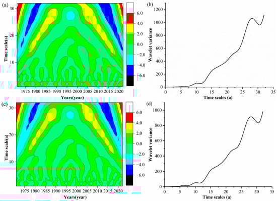 Morlet wavelet analysis involves the translation and scaling of a fundamental wavelet function. It uses a series of functions to represent or approximate signals. This technique boasts superior localization in both time and frequency domains. It is particularly effective for processing non-stationary data in image and signal analysis. Wavelet analysis is effective for detecting temperature cycles. The wavelet coefficient illustrates the local characteristics of the signal across various time scales, and its significance aids in assessing whether periodic oscillations at a particular time scale are statistically significant. This enables the identification of primary cycles in temperature data while mitigating the impact of random factors. Additionally, wavelet variance indicates the intensity or amplitude of temperature fluctuations over different periods. Higher wavelet variance signifies more pronounced periodic oscillations at that specific time scale. The real part of the wavelet analysis graphically depicts time–frequency variations in oscillation cycles at various scales. It provides invaluable insights into periodic temperature changes. Conversely, the wavelet variance plot illustrates the distribution of temperature fluctuations across time scales, highlighting the relative intensity of disturbances. The scale corresponding to the variance peak denotes the principal time scale, signifying the predominant periodicity in the time series [43,44,45,46]. In this study, the series for mean, maximum, and minimum temperatures were extended using the Signal Extension tool from the Wavelet Toolbox in MATLAB 2017b. Subsequently, these extended series were analyzed through a Morlet wavelet transform, specifically utilizing the ‘cmor’ wavelet function to explore their multi-time scale characteristics.