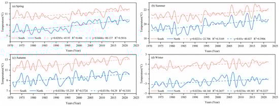 The analysis of inter-seasonal temperature variations based on daily mean temperatures reveals three main differences between the spring–winter and summer–autumn seasons in the northern and southern regions of the Mts. Qinling, as illustrated in Figure 4. Firstly, the rates of temperature change in spring were the highest of all seasons, measuring 0.368 °C/10a in the South and 0.498 °C/10a in the North. Secondly, the rates of linear temperature change during winter also exhibited significant increases, ranking as the second highest annually at 0.257 °C/10a in the South and 0.289 °C/10a in the North. Thirdly, across both spring and winter, the North showed higher temperature change rates compared to the South. Conversely, the trend rates during the summer–autumn periods were lower than those in spring–winter. Notably, the trend rate of temperature change in the North was lower than that in the South during these warmer months.
