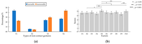 For Q3 and Q4, the data have passed the run test with p > 0.05. It means that the data for learnability and memorability of non-contact gestures are random and have the characteristics of representativeness. The corresponding percentages are shown in Figure 2a. T1 is considered to be the easiest to learn with 43.66%, followed by T4 with 26.76%, T3 with 23.94%, and T2 with 5.63%, respectively. T4 is considered to be the easiest to memorize with 43.66%, then T2 with 29.58%, T1 with 22.54%, and T3 with 4.23%, respectively. It indicates that simple one-handed gestures are considered to be the easiest to learn, and gestures associated with habits are considered to be the easiest to memorize.