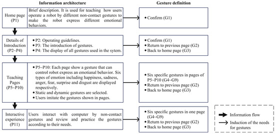The interaction architecture and gesture definition are quite important in stage 2, for they provide the basis of interaction implementation. The interaction architecture is shown in Figure 3, in which the interaction flow of the designed system is given. It includes the home page, introductions, teaching process, and interactive experience. The introductions consist of the operation guide, the description of different gestures, and the display of all gestures used in this system. The teaching process is to teach users the gestures that can be used to control the robot. In the page of interactive experience, users can interact with the designed system depending on their own needs and interests.