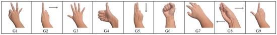 Rapid prototyping is necessary for the evaluation of the designed gesture-based non-contact interaction system. Its implementation requires gesture capture and recognition. For this case study, the hardware devices consist of Leap Motion and PC. Leap Motion is used to capture the fingers’ positions and motions of users’ gestures (G1–G9). PC is used to provide the screen to show the UI to users and compute the gesture recognition algorithm. In order to quickly achieve interaction, the finger positions of users are captured first, and then different recognition conditions are designed according to the hand postures and the distances between each finger. For example, for G4 in Figure 4, the condition of recognition is to stretch the thumb while making a fist with the other four fingers. If the condition returns true, the current UI goes to the next, which means the users can see the new page. The software consists of the codes written in Processing 4.0 recognizing the users’ gestures and displaying the UIs on the screen.