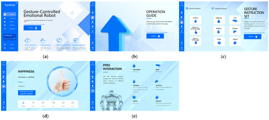 The UI design of the developed system should pay attention to displaying the symbols of gestures to prompt users, in order to improve the efficiency of the interaction. The number of UIs that need to be designed and the corresponding topics are also deduced by the interaction architecture. For this case study, 11 pages named from P1 to P11 are needed, as shown in Figure 3. P1 is for the homepage. P2–P4 show the details of introductions, respectively. P5–P10 are the teaching pages, and P11 is the page of free interactive experience. To facilitate user perception, UIs with similar functions use the same layout. For example, P2 and P3 have the same layout, for both of them illustrate the introductions, and pages from P5 to P10 use the same layout, for they are all used to display teaching gestures. Examples of UIs, P1, P2, P4, P5, and P11, are shown in Figure 5, respectively. The employed robot, Yanshee, can also be seen in Figure 5e.