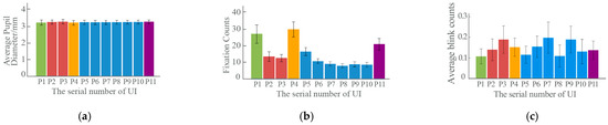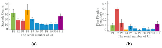 The data of average pupil diameter, fixation counts, and average blink counts basically meet the normal distribution, while not all data of saccade counts and first fixation durations show the normal distribution. To understand the perception difference of UIs, the repeated-measures ANOVA and the Friedman M test were employed respectively for normal and non-normal data. The average pupil diameter, fixation counts, and average blink counts were analyzed by the repeated-measures ANOVA, respectively, using the Mauchly’s test of sphericity, p < 0.001. Then the corresponding results of average pupil diameter, fixation counts, and average blink counts by the multivariate test are shown in Table 5. The corresponding estimated marginal means are shown in Figure 6a–c, respectively, where different colors represent different layouts of UIs. The Friedman M test was employed to analyze the data of saccade counts and first fixation durations. The corresponding error bar charts are shown in Figure 7a,b, respectively. It is obvious that each time when the layouts of UIs change, the values of fixation counts, saccade counts, and first fixation durations show relatively large fluctuation as shown in Figure 6b and Figure 7a,b. Hence, the analysis for these three is focused on P1, P2, P4, P5, and P11. Then, for saccade counts and first fixation durations, p < 0.001 by the Friedman M test.