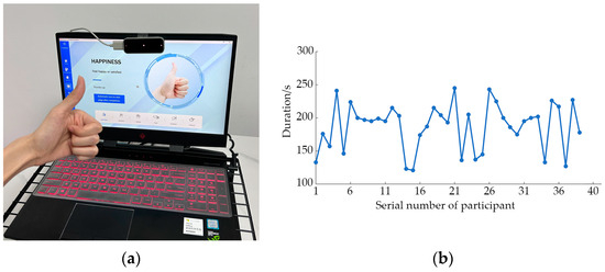 To test the usability of the designed non-contact interaction system using gestures, 41 of the participants involved in eye tracking participated in the SUS test. They were fully informed of the test and were paid cash rewards after the test. At the beginning, they were required to read an introduction, then began to interact with the system. An example of a user interacting with the designed system is shown in Figure 8a. After that, they were asked to answer the SUS questionnaire according to their real feelings. The SUS questionnaire used for the designed system is shown in Table A1 in Appendix A. The durations of interactions were recorded. Most of the users were able to complete the task and interact with the system. Finally, 39 valid experimental datasets were obtained. The durations of interaction for the participants who completed the task are shown in Figure 8b. The average duration for completing the interaction is 187.2 s, and the SD is 35.4 s.