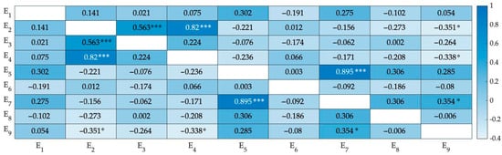 The subjective data, including the duration of interaction and the scores of SUS, learnability, and satisfaction, and the objective data, including fixation counts, average pupil diameter, saccade counts, average blink counts, and first fixation durations, are named from E1 to E9, respectively. The Spearman correlation method was employed to analyze the correlations, and the corresponding heatmap is shown in Figure 9. The results show that there are correlations between fixation counts and saccade counts (p < 0.001, s = 0.895), saccade counts and first fixation durations (p = 0.027, s = 0.354), first fixation durations and scores of SUS (p = 0.029, s = −0.351), first fixation durations and scores of satisfaction (p = 0.035, s = −0.338), the scores of SUS and learnability (p < 0.001, s = 0.563), and the scores of SUS and satisfaction (p < 0.001, s = 0.82), respectively. In addition, the duration of interaction does not show correlations with the scores of SUS, learnability, satisfaction, and the data of objective evaluations, with all p > 0.05.