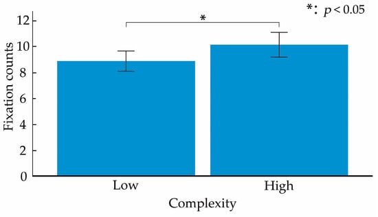 All data passed the homogeneity tests. For the effects of gesture complexity, the tests of within-subjects effects showed F(1, 318) = 4.026, p = 0.046, and partial η² = 0.013 for fixation counts, while p = 0.364 and p = 0.104, respectively, for average blink counts and saccade counts. For the effects of postural extension, the tests of within-subjects effects showed p = 0.959, p = 0.142, and p = 0.173, respectively, for fixation counts, average blink counts, and saccade counts. The results reveal that gesture complexity has a significant effect on fixation counts (p < 0.05) but no effects on average blink counts and saccade counts (p > 0.05), while postural extension shows no effects on the three (p > 0.05). The estimated marginal means of fixation counts are illustrated in Figure 10. The means and standard errors (SEs) for low and high gesture complexities are M = 8.828, SE = 0.394 and M = 10.078, SE = 0.483, respectively. This indicates that high gesture complexity leads to relatively high fixation counts, which also means relatively low searching efficiency for information.