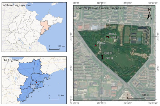 The Qingdao Olympic Sculpture and Culture Park was built in 2003, and it is the largest urban park green space in Chengyang District, with an area of 430,000 m2 (Figure 1). The climate in this region is typical of a warm temperate monsoon continental climate, and the mean annual air temperature is 12.6 °C. The minimum air temperatures are always in January, and the monthly mean temperature is −2 °C. The maximum temperature is often in August, with the monthly mean air temperature of 25.7 °C. The mean annual precipitation is about 700 mm, mostly falling in summer (i.e., June–August), and there is little rainfall in autumn (i.e., September–November), winter (i.e., December–February) and spring (i.e., March–May). The soil of the park is dominated by brown soil based on the Chinese Soil Taxonomy (Haplic Luvisol in FAO classification). About 300 plant species are planted in the park, with a total of 1.1 million standing trees and shrubs distributed throughout its grounds.