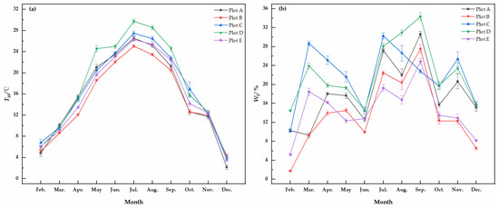 Monthly variations in T10, W5 for the five plant communities. (a) Monthly variation in T10, (b) monthly variation in W5. Plot A, Plot B, Plot C, Plot D and Plot E indicate the Prunus serrulata var. lannesiana community, Cedrus deodara community, Ginkgo biloba community, Poa pratensis community and Aucuba japonica var. variegate community, respectively.