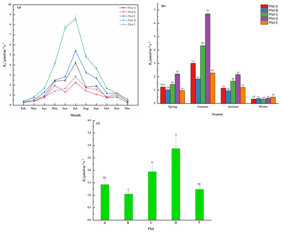 Seasonal changes and variations in soil respiration for the five plant communities. (a) Monthly variation in RS, (b) seasonal changes of RS, (c) comparison of annual mean RS. Plot A, Plot B, Plot C, Plot D and Plot E indicate the Prunus serrulata var. lannesiana community, Cedrus deodara community, Ginkgo biloba community, Poa pratensis community and Aucuba japonica var. variegate community, respectively. Different uppercase letters indicate significant differences in the same season for the different communities (p < 0.05); different lowercase letters indicate significant differences between seasons for the same communities (p < 0.05).