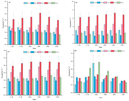 Daily variation in soil respiration for the five plant communities. (a) Spring, (b) summer, (c) autumn, (d) winter. Plot A, Plot B, Plot C, Plot D and Plot E indicate the Prunus serrulata var. lannesiana community, Cedrus deodara community, Ginkgo biloba community, Poa pratensis community and Aucuba japonica var. variegate community, respectively.