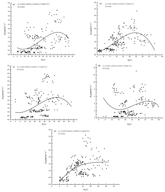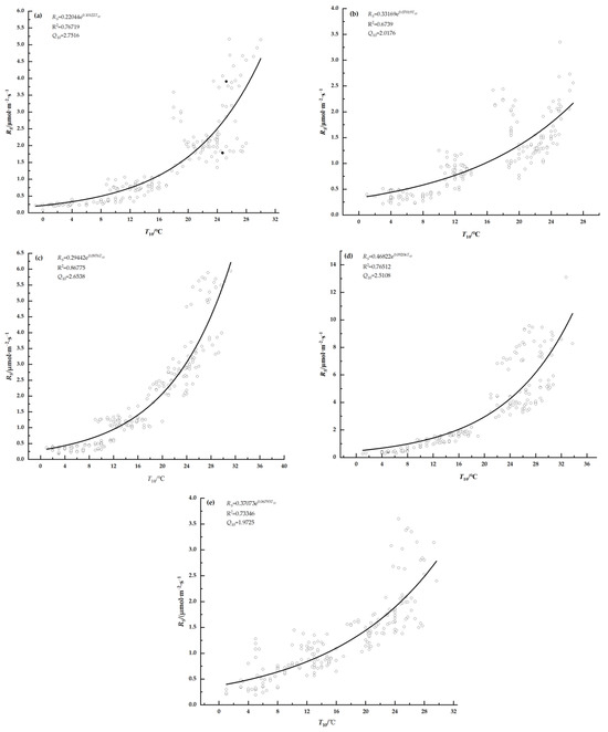 As depicted in Figure 2 and Figure 3, RS increased with the increase in T10. Hence, there was a significant positive correlation (p < 0.01) between RS and T10 for the three vegetation types. It was found that the exponential equation (RS = aebT10) was the most appropriate model to describe the response of RS to T (Figure 5). The regression analysis results indicated that T10 could account for 76.72%, 67.39%, 86.76%, 76.51% and 73.35% of the variation in RS for the P. serrulata var. lannesiana community, C. deodara community, G. biloba community and lawn and shrub communities, respectively.