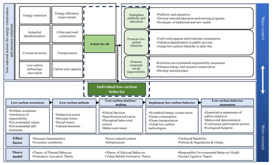 Figure 1 illustrates a framework for low-carbon behaviour research that includes macro-policies, meso-social dimensions, and micro-individual levels. The macro-level is concerned with technological innovation and energy transition, whereas the meso-level is focused on lifestyle adjustments and education. The micro-level examines the cognition, attitudes, and implementation of individual low-carbon behaviour. The framework considers personal, economic, and socio-cultural factors, in addition to relevant theoretical models. This implies that low-carbon behaviour is a multi-level, interdisciplinary research field that requires a comprehensive analysis to address climate change.