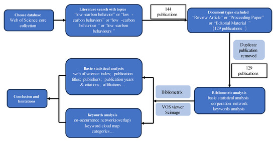 In this study, the dataset is sourced from the Web of Science Core Collection (WoSCC). This highly authoritative and extensively utilised resource features high-quality journals and offers a comprehensive data structure, enhancing the depth and accuracy of bibliometric analysis [35]. To enhance the transparency and reproducibility of this research, the coverage years for each sub-dataset are disclosed: Science Citation Index Expanded (SCI-EXPANDED, 1970–present), Social Sciences Citation Index (SSCI, 1970–present), Arts & Humanities Citation Index (A&HCI, 1975–present), and Emerging Sources Citation Index (ESCI, 2005–present) [36,37,38]. The search was conducted on 11 July 2024, and employed the following strategy: Topic = (“low-carbon behaviour” OR “low-carbon behaviours” OR “low-carbon behaviour” OR “low-carbon behaviours”), excluding document types = (“Review Article” OR “Proceeding Paper” OR “Editorial Material”). No limitations were set on publication years or language. This comprehensive approach resulted in the selection of 129 articles for visual analysis, ensuring transparency and reproducibility of the data collection process. This article selects the Web of Science Core Collection as the database. The Web of Science Core Collection is the recommended database for bibliometric research, encompassing leading journals across disciplines with extensive citation indexing and superior data quality as well as consistency [39]. Its rigorous selection criteria, robust analytical tools, and multi-faceted search capabilities offer dependable and extensive data assistance for bibliometric research [40].