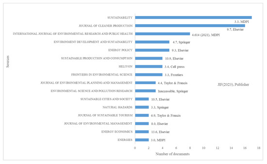 The 16 academic journals that have made the most significant contributions to the literature on low-carbon behaviour are described in Figure 3. Representing nearly 63% of the total number of articles published, 81 papers have been published in the best 16 of 25 publications. Specifically, Sustainability and the Journal of Cleaner Production are two of the most prominent magazines, and they publish over one-fourth of all research articles on low-carbon behaviour. The vast majority of these publications are concerned with energy, ecology, or sustainability. The journal impact factors (JIF) shown in the figure are generally high, with most ranging from 3.0 to 13.6, reflecting the importance of these journals in academia. In terms of publishers, Elsevier and MDPI dominate, publishing several high-impact journals, while other renowned publishers, such as Springer and Taylor & Francis, also make significant contributions.