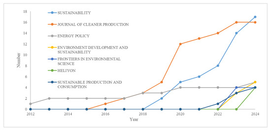 Figure 4 illustrates the trajectory of publications in five premier journals in terms of total publications that specialise in low-carbon behaviour from 2012 to 2024. The total publication volumes of the Journal of Cleaner Production and Sustainability are the highest, with 82 and 52 articles, respectively. They have experienced the most substantial increase in publications during this period, particularly after 2018, which is indicative of the increasing emphasis on sustainable practices and clean production. A substantial corpus of work has been published in recent years, as evidenced by the Journal of Cleaner Production’s peak around 2023. Sustainability exhibits a comparable trajectory, with a substantial increase that commenced in 2018 and will persist until 2024. The earliest journal that included research papers on low-carbon behaviour was Energy Policy, which ranks third in total publication volume. It has steadily increased in publication from 2012 to 2024. Among the seven journals, Environment Development and Sustainability, Frontiers in Environmental Science, and Sustainable Production and Consumption are tied for fourth place, demonstrating an upward trend. This suggests that there is a growing emphasis on environmental concerns in the context of sustainable development. In conclusion, this figure indicates that there has been a substantial increase in scholarly output in the fields of environmental health, sustainable production, and sustainability in recent years.