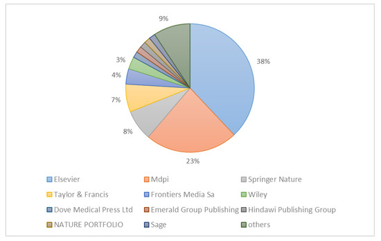 The publishers of publications related to low-carbon behaviour are depicted in Figure 5. Elsevier is the leading publisher, with 38% of all publications (49 papers), a significant increase to 23% for MDPI. The percentage of Taylor & Francis Wiley and Spring Nature is approximately 9%.