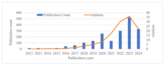 Visual representations of the evolution of research output and scholarly impact in the field of low-carbon behaviour studies from 2012 to 2024 are illustrated in Figure 6. The initial search in the Web of Science Core Collection identified 129 papers on low-carbon behaviour published up to July 2024, with the earliest paper in this dataset dating from 2012. However, it is essential to note that this may not represent the absolute beginning of research in this field due to the limited publication coverage before the 1990s and inconsistent indexing of authors’ KeyWords Plus before 2000 [41]. The number of citations is presented as an orange line, while the publication count for each year is represented by the blue bars. The publication count indicates a gradual increase from 2012 to 2019, emphasising a growing interest in low-carbon behaviour research. A substantial increase in the number of publications was observed in 2020, with the figure nearly doubling in comparison to the previous year. In 2021 and 2022, this upward trend persisted, culminating in 2023 with more than 500 publications. The orange line illustrates the general trajectory of the citation trend, which is comparable to that of the publication count, albeit with a discernible delay. Reflecting the time required for new research to achieve recognition and impact, citations remain relatively low and consistent from 2012 to 2019. Citations began to increase more rapidly in 2020, simultaneously with an increase in publication counts. This pattern reaches its pinnacle in 2023, with approximately 35 citations, suggesting that the research published in the years prior have garnered significant academic attention. At the time of writing, the year 2024 is still not finished, but is already showing a positive increment. This is to show that both publications and citations for low carbon behaviour are trending and increasing. One of the critical factors in the extraordinary increase in the number of low-carbon management research papers in recent years is related to global environmental and policy changes, especially the Chinese government’s financial support for achieving carbon neutrality and zero carbon development [42,43,44]. In 2020, China put forward a national strategy of carbon peak by 2030 and carbon neutrality by 2060, prompting the rise of a large number of related research articles and attracting international attention.