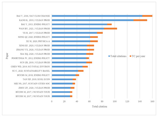 The cumulative citation counts and annual citation rates of the 20 most influential publications in the field of low-carbon behaviour, as determined by their global citation impact, are illustrated in Figure 7. Rai V (2016) ’s leading paper in Nature Climate Change has the maximum number of total citations, which suggests that it has a substantial influence and impact on the field. Kang K (2019) and Bai Y (2013), both published in the Journal of Cleaner Production and Energy Policy, similarly exhibit high citation counts, underscoring the significance of research on low-carbon behaviour in these journals. Notably, the list is dominated by numerous papers published in the Journal of Cleaner Production and Energy Policy, which implies that these journals are the primary sources of high-impact research on low-carbon behaviour. There is a consistent presence of papers from the 2020s, which suggests that there is a developing interest and recent progress in this field. The total citation (TC) per year metric can identify recent works that are garnering rapid attention, whereas total citations provide a measure of a paper’s overall impact; the bar lengths indicate this. For instance, the high TC per year of papers by Wan BY (2021) and Ye H (2017) is indicative of their significant contemporary relevance, although they are more recent publications. From the figure, after the year 2014, the TC for each author increased more than in the year 2013 and below. This shows the trend of literature publication.
