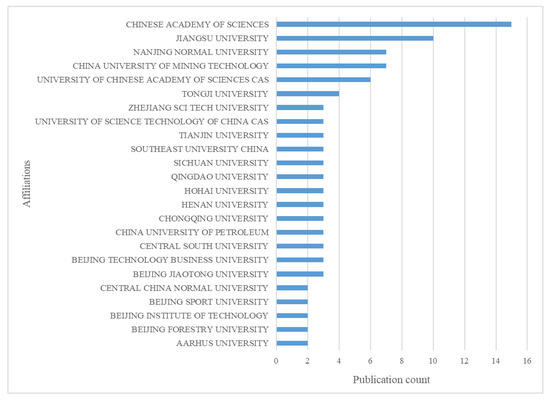 Figure 8 illustrates the contributions of various institutions in the field of “low-carbon behaviour” research. The graph is based on data from 214 institutions that have published relevant papers, highlighting 24 institutions that have published two or more papers. Notably, 23 of these institutions are from China, emphasising China’s absolute dominant position in the field of “low-carbon behaviour” research. The data clearly show that the Chinese Academy of Sciences leads by a significant margin with 15 publications, underscoring its central role in this field. It is closely followed by Jiangsu University (10 publications), Nanjing Normal University, and the China University of Mining Technology (7 publications each). It is worth noting that the top-ranking institutions also include renowned universities, such as the University of Chinese Academy of Sciences and Tongji University, reflecting the widespread engagement of Chinese higher education institutions in low-carbon behaviour research.