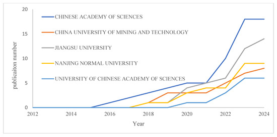 The publication trends over time for the top five affiliations that contribute to research on low-carbon behaviour are depicted in Figure 9. The Chinese Academy of Sciences has experienced a significant increase in publications since 2018, reaching a zenith of approximately 19 publications in 2024. This is indicative of its substantial and expanding influence within the field. Jiangsu University, Nanjing Normal University, and the China University of Mining and Technology have also experienced substantial increases in publications, particularly from 2020 onwards, underscoring their emerging positions in this research area. In particular, Jiangsu University experienced a significant increase in publications beginning in 2021, with an estimated 16 publications by 2024. Similarly, the University of Chinese Academy of Sciences and Nanjing Normal University exhibit consistent growth, with publication numbers increasing consistently from 2018 to 2024. This trend suggests that there is a growing academic interest and investment in low-carbon behaviour research at these institutions.