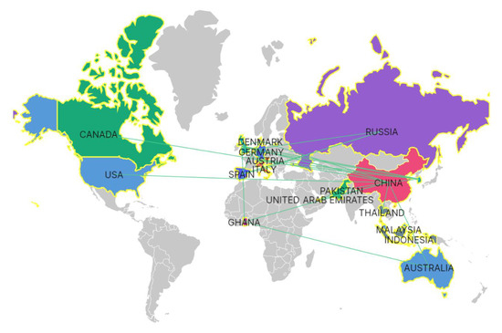 The statistical data indicate that the authors of 129 publications are from 21 countries and regions. Countries and regions are represented in Figure 10 according to the quantity of research publications. These 21 countries and regions comprise nine distinct categories. First in terms of research publications is China (106 publications), followed by the United Kingdom (13 publications), Australia (5 publications), and Germany (5 publications). China has already accomplished significant research on low-carbon behaviour. The green line, which denotes the co-author relationship, also demonstrates that China is the most active country in the field of low-carbon behaviour research. These findings corroborate numerous studies demonstrating China’s significant increase in academic publications in both natural sciences (SCIE-indexed papers) and social sciences (SSCI-indexed papers) [45,46]. This trend reflects China’s expanding influence in the global academic landscape. Factors contributing to this growth may include increased research funding, enhanced international collaborations, and supportive science and technology policies. This phenomenon not only exemplifies China’s advancing research capabilities but also signals a shift in the global distribution of academic influence, potentially having profound implications for international scientific cooperation.