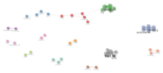 The collaboration network of publications related to low-carbon behaviour is depicted in Figure 11. It emphasises the presence of numerous clusters of authors who frequently collaborate on this research topic. The various hues are indicative of distinct collaboration groups, which are closely-knit networks of researchers who collaborate. The graph reveals several distinct collaborative clusters. The most prominent is a large group centred around “tian lx” and “fu m”, who appear to be critical researchers in this field. Other notable clusters include those centred around “gong yc” and “li y”, as well as a collaborative pair of “bruce g” and “ambrose m”. The relative isolation of these clusters suggests a degree of research fragmentation within the field. Additionally, several smaller or isolated nodes indicate the presence of emerging or independent research efforts. Overall, this network visualisation illustrates the collaborative patterns, principal research teams, and potential research diversification within the field of low-carbon behaviour studies.