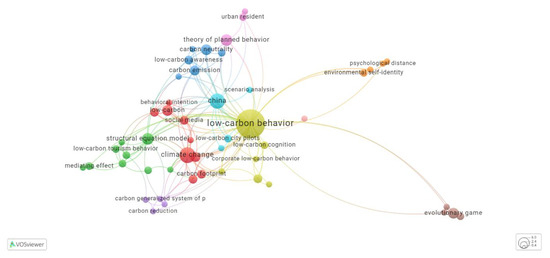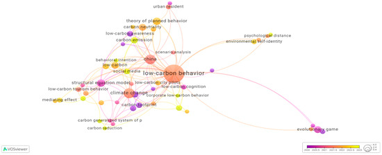 The temporal progression of research is illustrated in Figure 13 by the colour gradient from purple to yellow. Research topics that were conducted in the past are depicted in purple, while those that were conducted more recently are depicted in yellow. In a more recent timeframe (yellow), keywords such as “environmental awareness”, “social media”, “carbon emission”, “place attachment”, “corporate low-carbon behaviour”, and “behavioural intention” are displayed, indicating emerging areas of interest in the study of low-carbon behaviour. The research trend denoted by these keywords emphasises the importance of a comprehensive and multidisciplinary approach to the promotion of low-carbon behaviour. It emphasises the significance of psychological factors (environmental awareness, place attachment, behavioural intention), the influence of social media, the critical role of reducing carbon emissions, and the substantial impact of corporate actions. This trend is indicative of a growing recognition that the effective promotion of low-carbon behaviours necessitates coordinated efforts at the individual, social, and organisational levels.