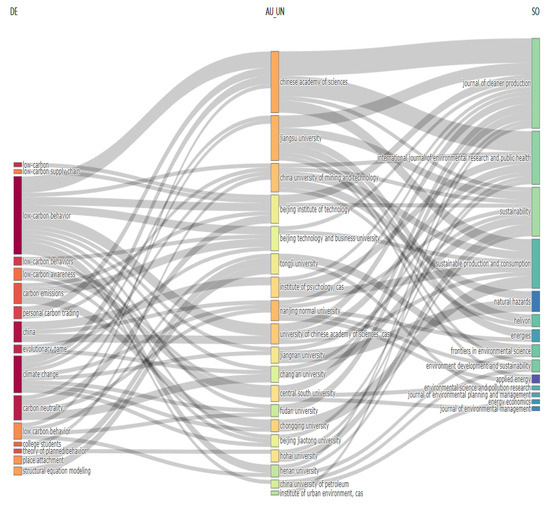The interconnections among keywords (DE), author affiliations (AU_UN), and publication sources (SO) within the domain of research focused on low-carbon behaviour are depicted in a three-dimensional plot presented in Figure 15. The primary concepts and topics that have been investigated in the corpus of research on low-carbon behaviour are represented in the DE column. Chinese institutions are conducting a substantial amount of research on low-carbon behaviour, as evidenced by the AU_UN column, which underscores their leadership in this field. According to the SO column, these journals are highly regarded in the disciplines of public health, sustainability, and environmental science, which is consistent with the research themes on low-carbon behaviour. The figure primarily showcases the collaborative actions and research output in the field of low-carbon behaviour, which are published in prominent environmental and sustainability journals and are primarily led by Chinese institutions.
