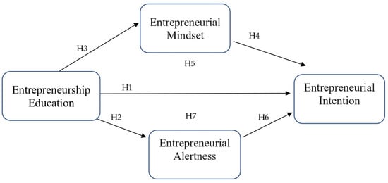 Thus, this study aims to explore the effects of EE on EI and examine the mediating effect of EM and EA on this relationship in graduate students. This study approach fills the gap in the literature by examining the relationship between EA and EE and responds to the calls for more research on the effects of EE [13]. Saadat et al. [14] investigated how EE and EM are related through the mediation of EA and suggested further research on other vital factors, such as EI. The literature has not sufficiently explored how EA and EM mediate the effect of EE on EI, and the relationship has not been adequately addressed [15]. By exploring how EE influences EI, educational practices can be improved to ensure that students who complete entrepreneurship programs can identify entrepreneurial opportunities—essential for supporting new venture creation. This study proposes a conceptual model of how EE can directly affect EI, and how EA and EM mediate the relationship between EE and EI.