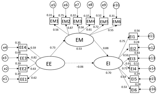 Table 6 and Figure 2 represent the effects of the EM and EA mediation model between EE and EI. The beta value of the relation between EE and EM is −0.73, which is significant. The R-square value of EM is 0.53, which suggests that EE explains 53% of the variation in EM. The beta value of the link between EM and EI is 0.88, suggesting a higher effect of EM on EI (induced by EE), given that the direct effect of EM on EI was 0.81. The R-square value of EI is 0.70, which shows the model explains 70% of the variation in EI. In terms of factor loading in Figure 2, some items were low (EI6; EM6; EM7; EM11). According to Hair et al. [62], items with low loadings can be retained if they are theoretically justified and contribute to the overall model fit. Therefore, the values are in acceptable ranges. In contrast, the model fit values of the complete model, which, after deleting the insignificant direct effects, were lower than the acceptable ranges. The CMIN/DF value is 1.6, within an acceptable range. The CFI and IFI values are 0.90 and 0.92, but the TLI and RFI values are below 0.9. The RMSEA value is also 0.09, above the threshold value of 0.08. Consequently, the researchers suggest partial acceptance of H5.