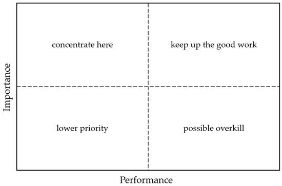 Importance–performance analysis (IPA), was first introduced by Martilla and James in 1977 [39]. Since the early 1990s, it has been widely applied in service industries, particularly in studies on destination image, tourist satisfaction, and service quality. This method is particularly suitable for evaluating the quality of swap platforms by measuring user expectations against actual satisfaction to identify areas for improvement, optimize resource allocation, and enhance user satisfaction. IPA requires respondents to evaluate various measurement indicators of a specified subject from the perspectives of importance and performance. The evaluation scores are then used to establish a coordinate system. Performance scores serve as the x-axis, and importance scores serve as the y-axis. The average values of importance and performance scores form the intersection of the two axes, dividing the coordinate system into four quadrants, as shown in Figure 2. The four quadrants represent the following: