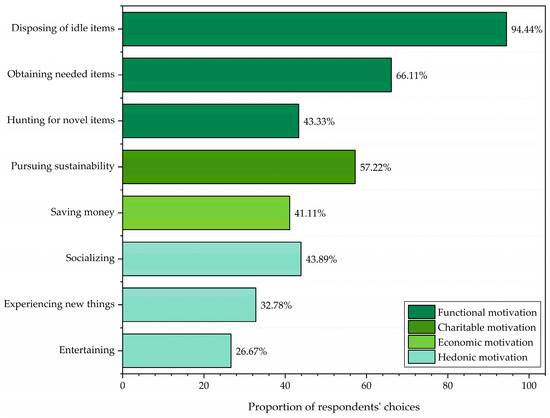 Hedonic motivation is classified as the fourth category of motivation. First, some respondents view participating in swaps as a way to socialize (43.89%), hoping to connect with others through the swap of goods. The values and lifestyles of people who participate in swap are often aligned, making it natural for conversations about goods and interests to occur in the swap scene. This study categorizes “socialize” under hedonic motivation because swaps in Shanghai primarily occur between strangers, and the social interactions among participants tend to be light and short-term, unlike in some other countries where community swaps foster deeper and longer-lasting social relationships [28,40]. The other two hedonic motivation options had lower selection rates (experiencing new things: 32.78%, entertaining: 26.27%). Nevertheless, their impact should not be overlooked, as those who value “experiences” or “fun”, although few in number, are likely the core value creators in swap activities. For example, stall owners who are frequently active at swap markets often bring high-quality goods and enjoy interacting with others, creating a positive atmosphere for the swap platform. Hedonic motivation indicates that users need interaction and entertainment on the platform, which is often created by the users themselves rather than directly provided by the platform. However, the platform can offer some support, such as strengthening community building and developing a credit system to enhance trust and foster a positive atmosphere. To encourage users to stay active, the platform can design incentive mechanisms. Additionally, the platform can host interesting activities to create more social and entertainment opportunities for users.