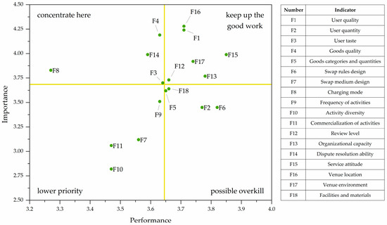 In the “low priority” quadrant, the prominent indicators are F7, “Swap medium design”, F10, “Diversity of activity forms”, and F11, “Commercialization of activities”. The remaining indicator is F9, “Frequency of activities”. The first indicator, “Swap medium design”, is an innovative feature of this platform, which was the first in China to provide intermediary objects in swap services. The effectiveness of using intermediary objects increases with the number of users, so continuous promotion is necessary. The last three indicators all belong to the activity planning category, indicating that although respondents do not have high expectations for the platform’s activity planning, they still hope to see improvements in this area. Indeed, the platform’s current swap markets offer relatively monotonous activities and have few merchant sales stalls, suggesting that the platform could develop more diverse activities and expand its business model within the context of the circular economy and collaborative consumption, in order to enhance its overall value. The fact that users want more frequent swap activities shows a significant demand for regular swap services, therefore the platform can consider establishing a permanent swap space or offering digital services in the future.