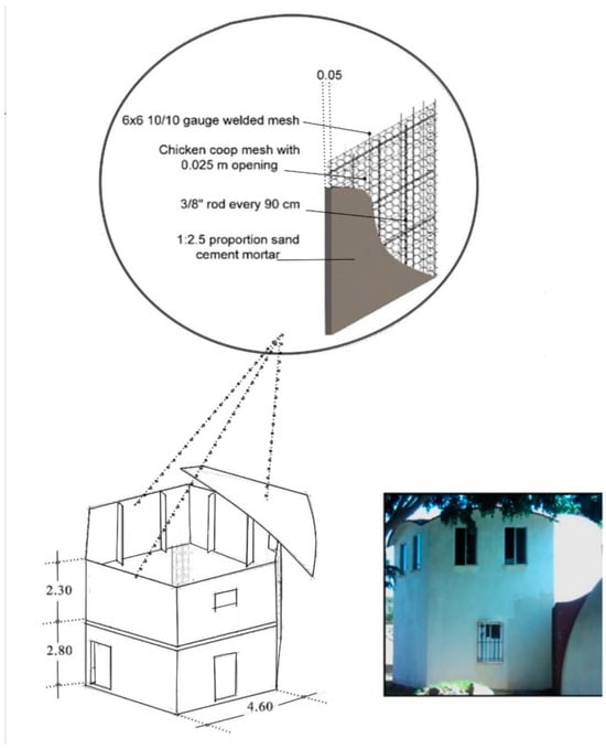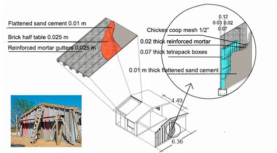 Figure 4 shows an isometric view of the MMTLM of the house with a construction system of reinforced mortar walls and empty milk boxes, known as Tetra Pak, and a reinforced mortar slab. The house has a surface area of 28.55 m2, the orientation of the house is north–south, the access door faces south, and it has two windows, one exposed to the south and another to the north. The blind walls are presented in the east–west direction like the other houses; the floor is made of concrete 0.1 m thick. The slab and wall system comprises reinforced mortar channels with variable lengths (2.8 to 3.50 m), widths of 0.5 m, and thicknesses of 0.03 m. Empty milk boxes (Tetra Pak) were placed inside the channels used on the walls.