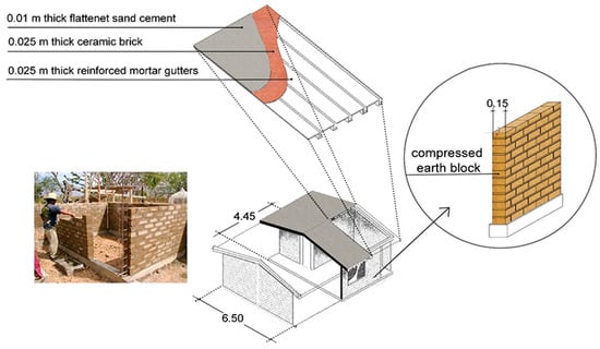 The isometric view of the MBSCLM house is shown in Figure 5. The house has a brick wall, compacted soil, and a reinforced mortar slab. Its total surface area is 28.92 m2 and faces the north–south direction. The entrance to the house is located on the southern side, and there are two windows—one facing south and the other facing north. The east–west walls are blind, similar to the other houses. The house floor is made of 0.1 m thick concrete, and the slab system comprises reinforced mortar channels with variable length sections ranging from 3.0 to 3.50 m, a width of 0.5 m, and a thickness of 0.03 m. The wall system includes soil blocks compacted with 8% cement and has a block section of 7 × 14 × 28 cm.