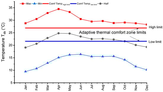 where Tn = neutral temperature (°C), Tm = average temperature (°C), and Tcz = temperature of the thermal comfort zone (°C). Therefore, the calculated mean temperature for Oaxaca was 22 °C, and the estimated annual neutral temperature was 24.42 °C. The thermal comfort zone at the site was determined to be between 21.92 °C and 26.92 °C. This methodology uses the adaptive model of thermal comfort. Figure 7 shows the temperatures and limits of the thermal comfort zone. This thermal comfort range is considered for people acclimatized to the site (Adaptive Thermal Comfort Model). Among the current thermal standards applicable to the built environment, the adaptive model provides greater flexibility to adapt indoor comfort temperatures to the outdoor climate, particularly in naturally ventilated buildings. Adaptive standards are considered more appropriate for establishing comfort in low-energy buildings.