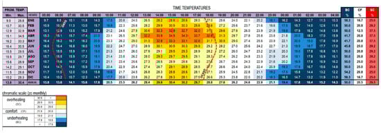 Figure 1 shows that the city of Oaxaca has a temperate bioclimate (white) and falls in the thermal comfort range of 21 to 26 °C with a total annual rainfall of 783.5 mm. The National Water Commission collected primary data from weather stations in Mexico and provided the data for the climate classification [23].