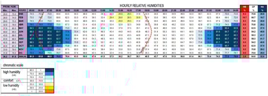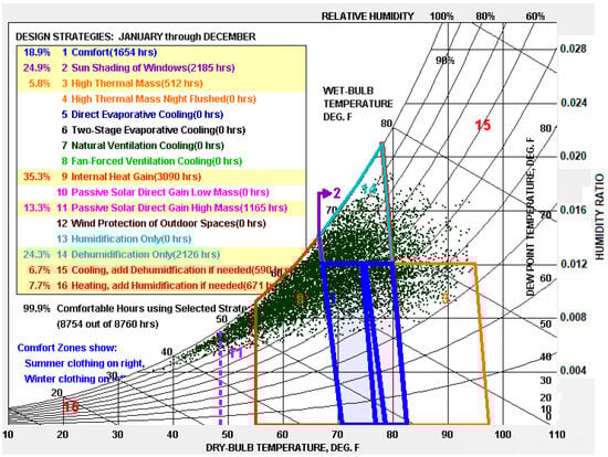 The data in Figure 11 are based on the psychrometric chart of Szokolay [28] from Software Climate Consultant 5.4, which is included in the EnergyPlusTM 2005, Design Builder Software Ltd. It uses an adaptive model applying the ASHRAE Standard. A climate file with an EPW extension generated in the Meteonorm software version 7.3 [29] was used for the input data. The Meteonorm software provides precise meteorological data for any location on Earth. It also has a program that calculates climatic parameters such as irradiation, temperature, humidity, wind, and precipitation. The software uses a dynamic methodology [30] that considers the user’s thermal adaptation, which correlates with the type of clothing and the internal temperature. This information indicates that the clothing represents a measure of the user’s adaptation.