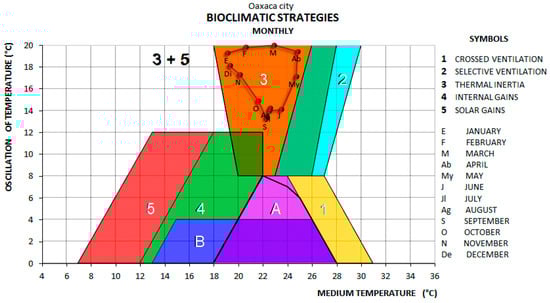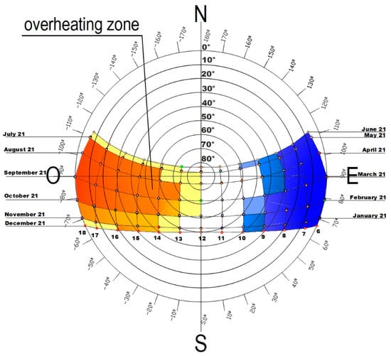 The solar graph in Figure 12 for Oaxaca was developed using the Olgyay method [31], and it displays monthly data on azimuth angle and solar altitude. The yellow zone on the graph represents the overheating area, which is present throughout the year from 1:00 to 4:00 p.m. On the other hand, the blue zone represents the underheating area, present from 6 to 10 a.m., except for March and April, when it extends until 9 a.m.