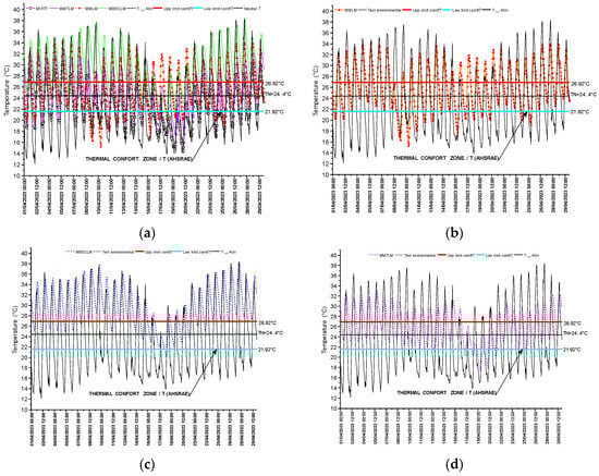 According to Figure 14a, the MHTIT prototype system achieved 45% thermal comfort, 14.03% overheating, and 40.97% underheating. In Figure 14b, the MMLM construction system achieved 44.31% thermal comfort, 41.53% overheating, and 14.17% underheating. In Figure 14c, the MBSCLM construction system received 23% thermal comfort, 75.83% overheating, and 1.1% underheating. Finally, in Figure 14d, the MMTLM constructive system had 48.06% thermal comfort, 43.61% overheating, and 8.33% underheating.