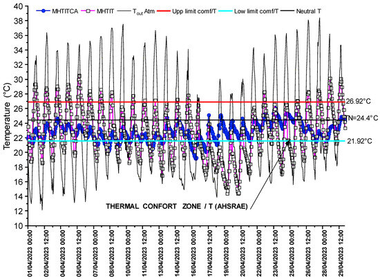 This section displays temperature measurements taken from inside the prototype housing. All the temperature records for the month studied (April 2023) were analyzed to determine the thermal comfort percentages and values above, below, or within the thermal comfort range.