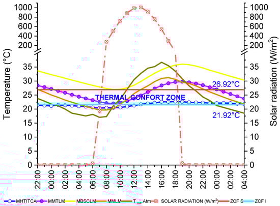 Compared with other alternative construction systems in Figure 14a, the proposed MHTIT ecofriendly house prototype system achieved a similar thermal comfort percentage of 45%, except for the MBSCLM system, which had a low thermal comfort value. The MHTIT system had an advantage over the other house prototypes as it had the lowest overheating value. This indicates that the system’s thermal inertia absorbed high temperatures from outside. However, the MHTIT system also had high temperatures below the thermal comfort range, as observed in Figure 14a.