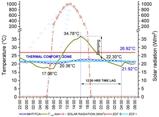Huelz et al. [33], in their simulations of time-dependent heat transfer, evaluated high-density concrete with an insulating layer of expanded polystyrene located in different positions, namely the outer, central, and inner parts. The results revealed that the function of the insulator is essential in the thermal performance of the element. The insulating layer in the inner part produces low damping and thermal time lag, while locating it in the outer part produces the best results, as in the MHTITCA system. Ulgen [39] highlights that the thermophysical properties and thickness of a building’s opaque components can result in temporary delays of up to 12 h between external and internal temperatures. The insulating layer and thermal inertia function effectively in this regard. As a result, the interior temperature remained within the local thermal comfort polygon, as defined by Szokolay [27], throughout April, typically the hottest month of the year.