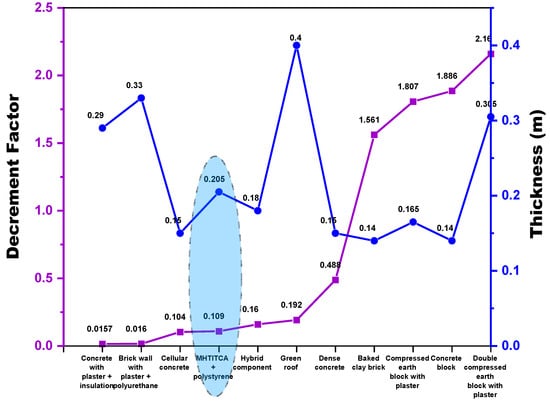 Figure 18 compares the variation of the decrement factor according to the thickness of the material wall studied by various authors. The reduction in the decrement factor defines the materials’ thermal storage capacity. In the case of the MHTITCA house prototype, the thermal inertia of the clay and the sawdust fiber, whose thermal conductivity is low, were combined. The decrement factor increased for materials that do not have thermal insulation (dense concrete, baked clay brick, compressed earth block with plaster, concrete block, and compressed earth block with plaster), for example, in studies [45,46].