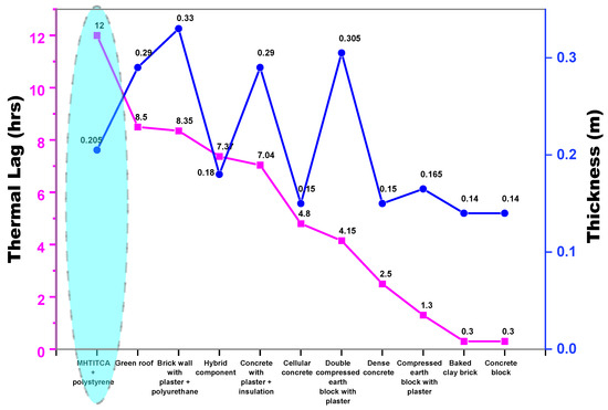 Figure 19 shows an increase in thermal damping with increasing component thickness. This is more evident with thicker materials, such as hybrid MHTITCA components, concrete with plaster on both sides + 0.5 m insulation on the outside, brick walls with plaster on both sides plus polyurethane insulation on the outside, cellular concrete, extensive green roofs, hybrid construction components, concrete with plaster on both sides + 0.5 m insulation on the outside, and compressed earth blocks with plaster. For materials with smaller thicknesses and without a layer of thermal insulation (dense concrete, compressed earth blocks with plaster, concrete blocks, and baked clay bricks), the thermal lag was low, for example, in [45,46].