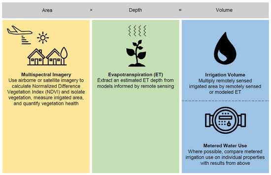 In this study we defined the volume of water required to maintain a healthy landscape as the product of the post hoc measured ET water depth and the irrigated area. We assumed that all of the water required for plant growth comes from irrigation, and we estimate a required irrigation volume to maintain plant health (Figure 1) [16]. As Utah only receives approximately 15 inches of precipitation per year, much in the winter as snow, plant wellness during the summer season relies heavily on irrigated water [17]. Figure 1 outlines the AIRS method. We used multispectral imagery to estimate irrigated area and plant health, published ET values to estimate water requirements, and meter data to obtain actual water use.