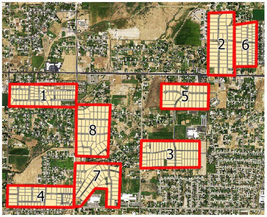 The centroid of these study areas is at 112.08° W 41.19° N. Six of the eight study areas are within one NAIP image, while the other two are in NAIP images taken immediately after. Because the NAIP images were taken so close together, we ignore any changing conditions over the short time difference. In Figure 2, we show the placement of the eight study areas and their individual metered property parcels.