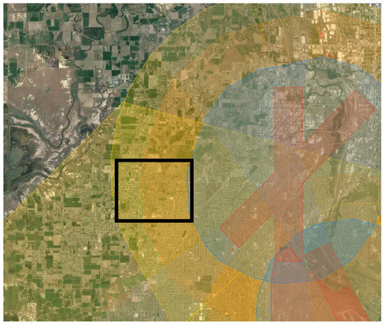 Because Weber County is home to Hill Air Force Base and Ogden-Hinckley Airport, many areas do not allow drone flights because of proximity to flight areas. We chose specific regions in our area of interest that were distant enough from these flight restrictions. Some parcels were in a restricted flight area that required permissions for flights. We received authorization to fly these areas from the Federal Aviation Administration (FAA) [20]. Figure 3 shows the GEO Zones as colors with our general study area in the black rectangle [20].