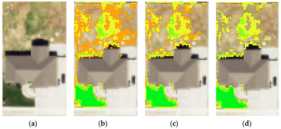 Adjusting NDVI threshold values. (a) Base image without NDVI pixels. (b) Base image with 0.10 NDVI threshold value. (c) Base image with 0.15 NDVI threshold value. (d) Base image with 0.19 NDVI threshold value.
